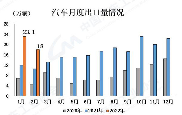 汽車出口同比繼續保持大幅增長 2月,汽車企業出口18萬輛,環比下降21.9%。同比增長60.8%,繼續保持大幅增長。1-2月,企業企業出口41.2萬輛,同比增長75%。
