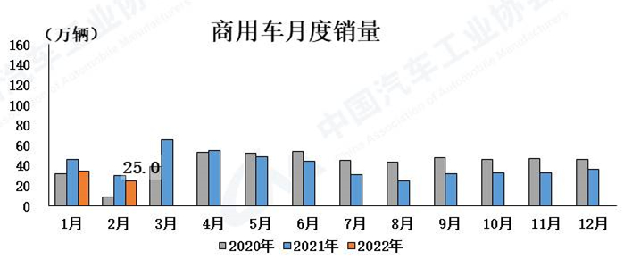 商用車同比降幅有所收窄 2月,商用車產銷分別完成27.9萬輛和25萬輛,環比分別下降19.2%和27.4%,同比分別下降18.3%和16.6%。1-2月,商用車產銷分別完成62.4萬輛和59.4萬輛,同比分別下降24%和21.7%。