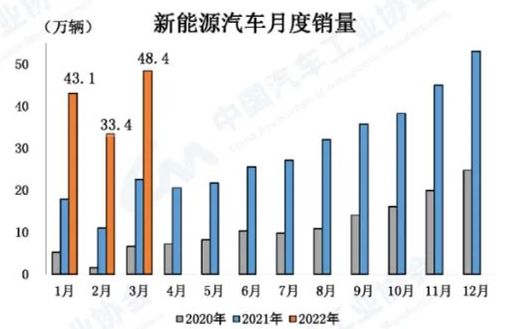 新能源汽車同比繼續保持高速增長 3月,新能源汽車產銷分別完成46.5萬輛和48.4萬輛,同比均增長1.1倍。1-3月,新能源汽車產銷分別完成129.3萬輛和125.7萬輛,同比均增長1.4倍。