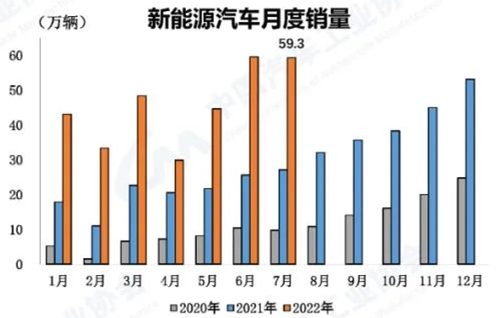 新能源汽車產銷繼續保持高速增長 7月,新能源汽車產銷分別完成61.7萬輛和59.3萬輛,同比均增長1.2倍。1-7月,新能源汽車產銷分別完成327.9萬輛和319.4萬輛,同比均增長1.2倍。