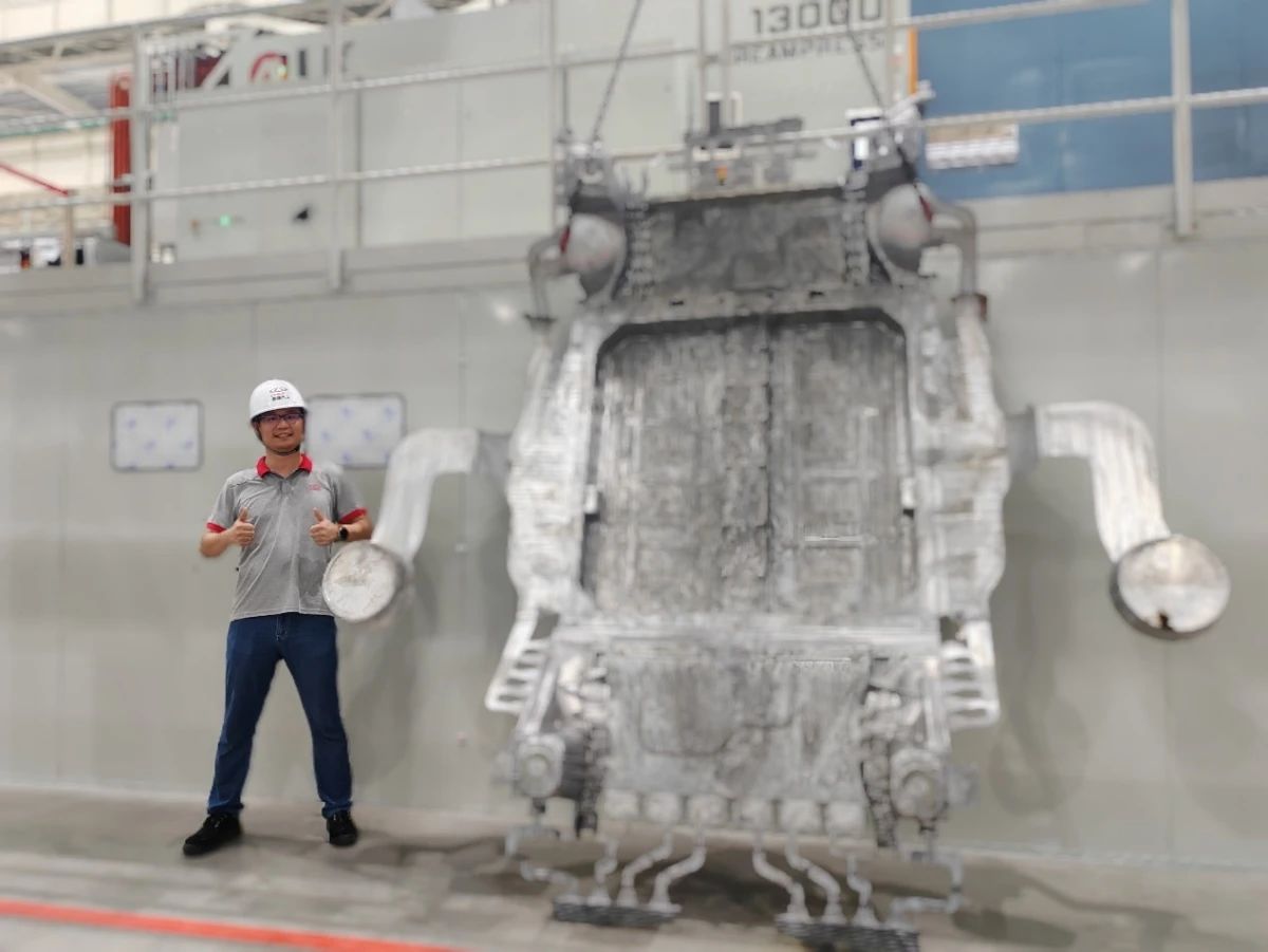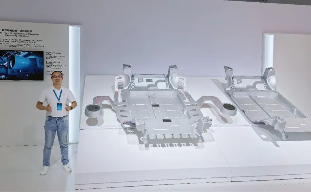 肖榕總工在超大型壓鑄件旁留影 安全守護,高性能保障 在高性能保障方面,奇瑞汽車采用了高強度、高流動性的新材料,使屈服強度和抗拉強度分別提升至≥150MPa和≥300MPa,分別比目前行業(yè)的高出24%和22%。此外,高動態(tài)壓射系統(tǒng)還進一步提升了材料的延伸率,達到44%的顯著提升。 降本增效,高集成設計 該技術還實現(xiàn)了高集成設計。通過優(yōu)化零件結構,奇瑞汽車將原本需要150多個零件組成的部件集成為一個整體。這一設計不僅大幅提升了零件的扭轉剛度,還顯著降低了成本,實現(xiàn)了22%的成本下降。同時,車身重量也減輕了20%,精度提高了15%,為汽車的輕量化、高效化提供了有力支持。