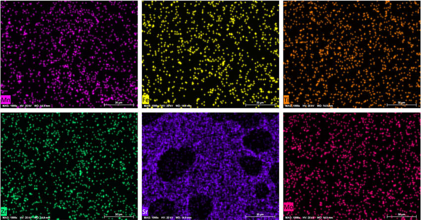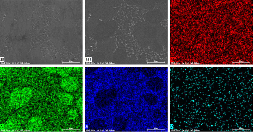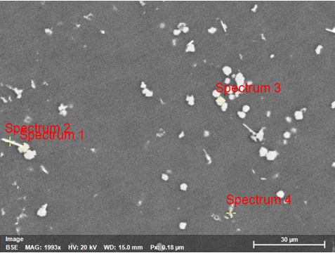 金相顯微鏡組織形貌 壓鑄后基體組織主要為尺寸細小且彌散分布的α-Al(白色顆粒)和共晶Si相(灰黑色區域),共晶Si呈纖維狀,無尺寸粗大的第二相,JY-1合金具有較高的強度和韌性。 3、掃描電鏡組織形貌及能譜分析數據: