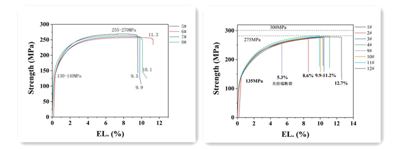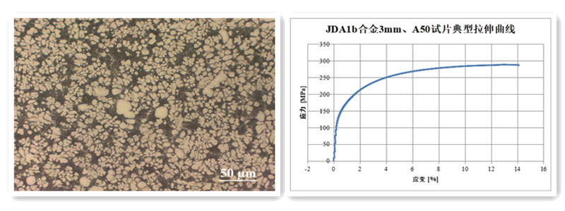 表1. JDA1b不同模具溫度、真空度、澆口速度、壓鑄溫度下材料的流動距離 b、以合金組織控制為出發點(圖1),創新性引入微量元素對組織進行變質、細化,確保合金組織細小,彌散,保證合金強度與塑性。綜合考慮免熱處理性能、鑄造性能及壓鑄工藝性等,鑄態下材料達到屈服130-150MPa,抗拉260-300MPa,延伸率12-15%的力學性能(圖2);