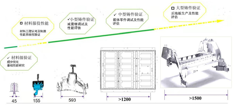 圖3. JDA1b合金減震塔 b、JDA1b合金一體化超大鑄件: 近日,上海交通大學輕合金國家工程中心與華人運通高合汽車共同研發的TechCastTM低碳鋁合金材料一體化超大壓鑄件正式獲得量產應用。TechCastTM正是結合JDA1b合金特性與華人運通一體化超大鑄件特點優化獲得的免熱處理壓鑄鋁合金。經過多輪研發攻關和零件驗證,在材料開發、性能優化、制造工藝和系統集成驗證等方面實現了100%全流程正向開發,在材料壓鑄性能、力學性能、制造性能、環境耐久性能等指標上表現優異。該材料流動性高于同級別材料15%以上、強塑積高出30%以上,保證了整車碰撞等性能達到更高維度。