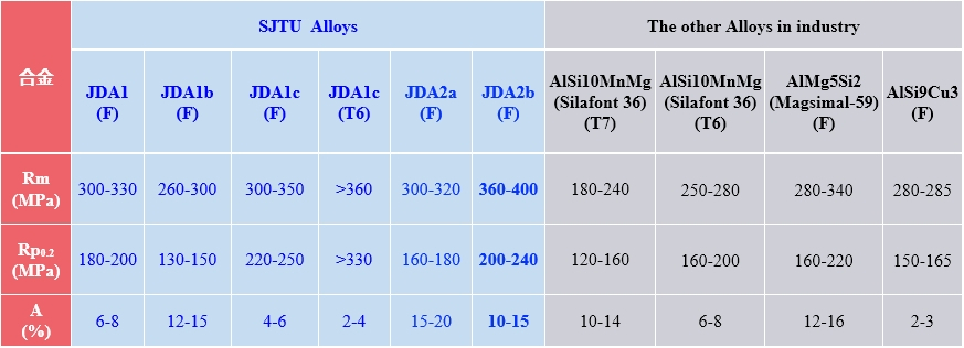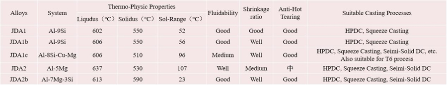 圖4. JDA1b合金超大一體化鑄件應用驗證流程 彭立明團隊其他免熱處理壓鑄鋁合金材料 經過多年開發、積累,上海交通大學輕合金中心丁文江院士、彭立明教授團隊,已成功開發2種合金體系5個亞型的免熱處理壓鑄鋁合金材料,滿足不同性能與應用場景需求。其中JDA1x是Al-Si-X系、JDA2x是Al-Mg-X體系。五種合金力學性能如下表2所示。從表中合金性能對比可以發下,JDA壓鑄鋁合金材料在鑄態下即可達到優異的力學性能,滿足不同應用場景下零部件的性能要求。表3為JDA合金部分鑄造性能參數。