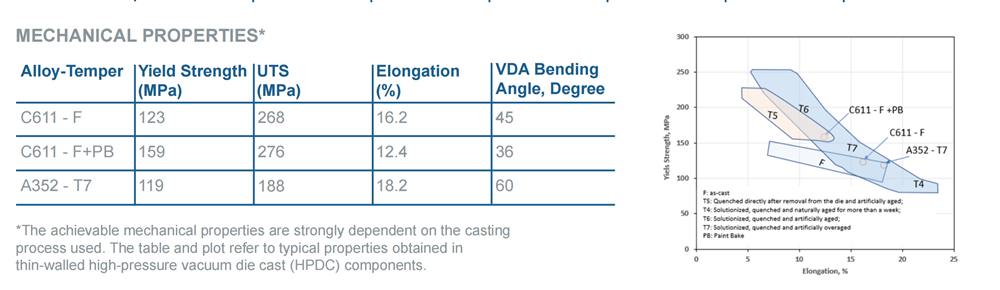 帥翼馳集團(tuán)新材料事業(yè)部總經(jīng)理 符文濤 作為國內(nèi)低碳鋁合金開發(fā)生產(chǎn)的頭部企業(yè),帥翼馳新材料集團(tuán)有限公司于2016年開始研發(fā)和推廣適用于大型一體化壓鑄的免熱處理合金材料,2019年開始驗證應(yīng)用免熱處理材料。目前,該公司牌號為C611的免熱處理材料已實現(xiàn)批量生產(chǎn),被成功應(yīng)用于國內(nèi)頭部新能源汽車品牌的車身后地板及前倉等零部件上。 帥翼馳集團(tuán)新材料事業(yè)部總經(jīng)理符文濤先生表示:“免熱處理鋁合金材料是一體化壓鑄技術(shù)成功的關(guān)鍵,我們開發(fā)的C611是一款定制材料,其可達(dá)成的性能范圍較寬,可以根據(jù)客戶需求做定制開發(fā),并能提供相應(yīng)的性能數(shù)據(jù),材料失效卡片,模流分析數(shù)據(jù)卡片,與材料相關(guān)鑄造工藝參數(shù)。因此,我們可以提供材料及其相關(guān)的工藝方案。” C611免熱處理材料性能參數(shù)如下: