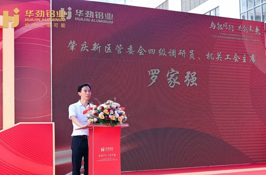 肇慶新區管委會四級調研員、機關工會主席羅家強先生致辭 肇慶新區管委會四級調研員、機關工會主席羅家強先生對華勁鋁業新工廠開業表示熱烈祝賀,并高度評價了華勁鋁業為肇慶新區、鼎湖區經濟發展做出的貢獻。他在致辭中表示,此次廣東華勁金屬肇慶新區增資擴建項目,將助力肇慶兩區新能源汽車產業快速發展,助推本地區產業轉型升級以及經濟高質量發展,未來新區政府將繼續為華勁鋁業在內的落戶企業提供高效優質的服務。