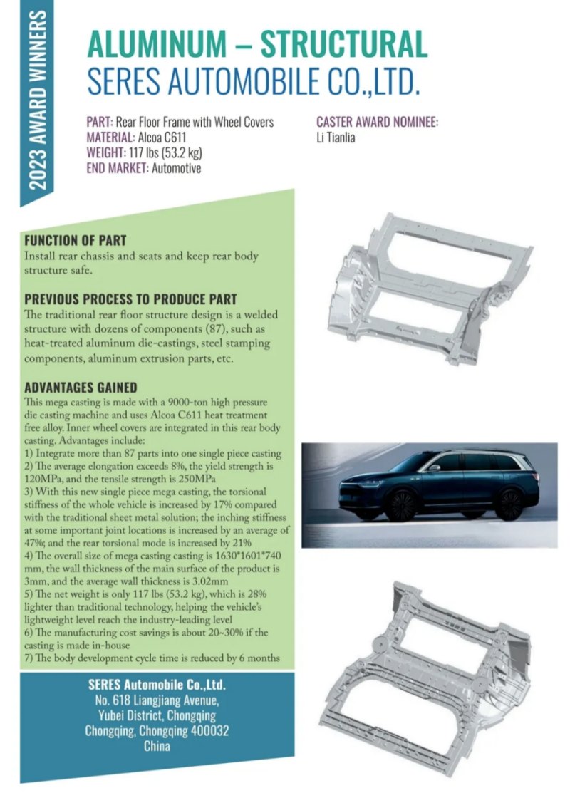 帥翼馳董事長程帥(左2)在頒獎現場 此次盛會頒發了北美壓鑄協會諸多年度大獎,其中,最值得關注的是最佳結構件評比大獎(Aluminum Structural),堪比壓鑄界的奧斯卡。經過激烈的競爭和評比,繼去年之后,本次最佳結構件評比大獎再一次頒給了國內車企的大型一體化壓鑄部件。由賽力斯汽車主導設計、文燦集團制造、帥翼馳新材料集團 /美鋁供應材料,三方聯合申報的“集成輪罩后地板總成(Rear Floor with Wheel Covers)方案”摘得桂冠。該方案的鑄件重53.2公斤,實現了市面上一體化壓鑄部件中最高的集成度(87件集成為1件),應用了最大噸位壓鑄機(力勁9000噸);同時,該鑄件實現了平均壁厚3.02mm,以及28%的輕量化效果,為車身開發周期縮短為6個月提供了有力的支撐。