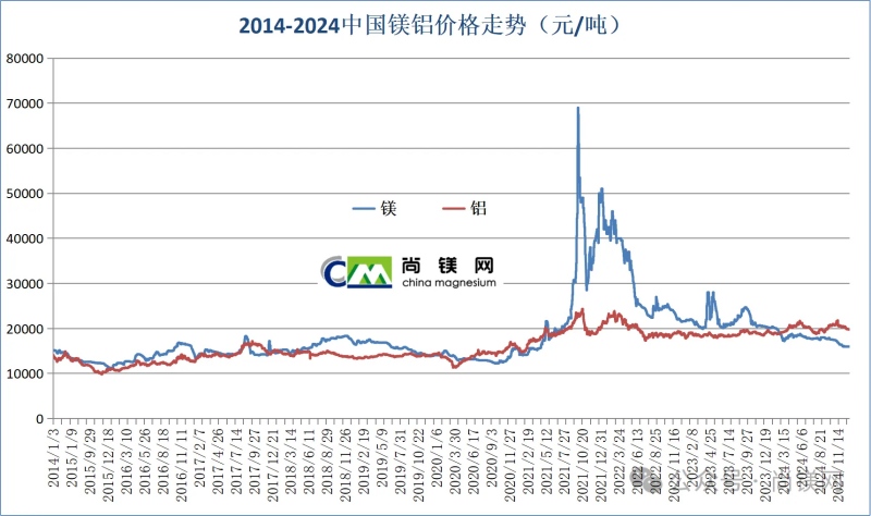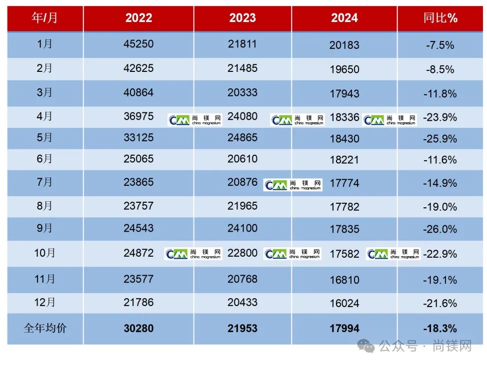 ![]() 2024年中國鎂錠價格一路下行,從年初的20200元/噸,下跌至年底的16000元/噸,16000元成為重要的價格支撐線。2024年底的鎂價格已經(jīng)跌回到2021年4月水平,為44個月來最低值。2024年鎂價格月度平均值從1月份的20183元/噸,跌至12月份的16024元/噸。2024全年平均價格為17994元/噸,與2023年同比下降了18.0%,為4年最低值。年內(nèi)價格凈跌去4200元,跌幅20.8%。 受鎂主產(chǎn)地榆林地區(qū)能耗雙控和環(huán)保整改影響,2021年9月中下旬開始的一輪鎂價格上漲周期大體上持續(xù)了8個月。隨著榆林地區(qū)鎂廠環(huán)保改造逐步完成,鎂生產(chǎn)和供求關(guān)系有了很大的改善,自2022年4月起,鎂價格進(jìn)入下降通道,鎂生產(chǎn)企業(yè)再陷入經(jīng)營困難時期。在成本因素支撐下,2022年下半年及2023年全年,鎂價格還能在20000-26000元之間波動,一直在20000元以上堅守。但是,進(jìn)入2024年,由于鎂廠改造和生產(chǎn)的全面恢復(fù),鎂供應(yīng)量進(jìn)一步增加,但是消費(fèi)端并沒有同步跟進(jìn),鎂價在2月份就跌破20000元,其中二、三月和4季度跌幅最大。由于商業(yè)收儲行動和季節(jié)性采購因素,第二、三季度價格有所反彈并有所維穩(wěn),但是11月份之后價格再度急劇下行。全年鎂價凈跌去4200元,跌幅20.8%。 2024年年初價格:20200元(1月2日) 2024年年末價:16000元(12月30日) 最低價:16000元(12月30日) 最高價:20400元(1月19日) 年度平均價:17994元 2022-2024年中國鎂錠月度平均價(元/噸)