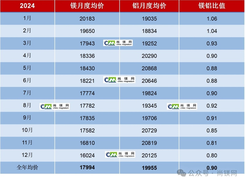 可以說,目前鎂價已經(jīng)超跌,鎂鋁比值已經(jīng)低于公認(rèn)的合理區(qū)間,鎂冶煉廠普遍處于虧損狀態(tài)。但是另一方面,鎂鋁比值的回歸,鎂的性價比再度凸顯,是有利于鎂合金應(yīng)用的重要信號。2025年,預(yù)計鎂鋁比值仍然會保持在合理區(qū)間,相關(guān)產(chǎn)業(yè)鏈人士應(yīng)該重新樹立鎂市場穩(wěn)定供應(yīng)的信心。 2024年中國鎂錠與鋁錠月度平均價及鋁鎂比值(元/噸)
