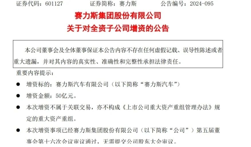 隆源股份成立于2006年,總部設(shè)在寧波北侖大碶高檔模具園區(qū),核心業(yè)務(wù)涵蓋鋁合金精密壓鑄件的研發(fā)、生產(chǎn)和銷售,產(chǎn)品廣泛應(yīng)用于汽車發(fā)動(dòng)機(jī)、轉(zhuǎn)向、熱管理及新能源汽車三電系統(tǒng)等領(lǐng)域。財(cái)務(wù)數(shù)據(jù)顯示,2022年和2023年,隆源股份的營(yíng)業(yè)收入分別為5.19億元和6.99億元,凈利潤(rùn)分別為1.01億元和1.26億元。 賽力斯擬斥資近82億元收購(gòu)超級(jí)工廠 9月13日,賽力斯發(fā)布公告,計(jì)劃向全資子公司賽力斯汽車增資50億元,以增強(qiáng)其資本實(shí)力。同時(shí)通過交易總價(jià)81.64億元收購(gòu)龍盛新能源100%的股權(quán),從而獲得其打造的賽力斯超級(jí)工廠所有權(quán),以保障其新能源汽車生產(chǎn)制造方面的自主權(quán)和控制力。