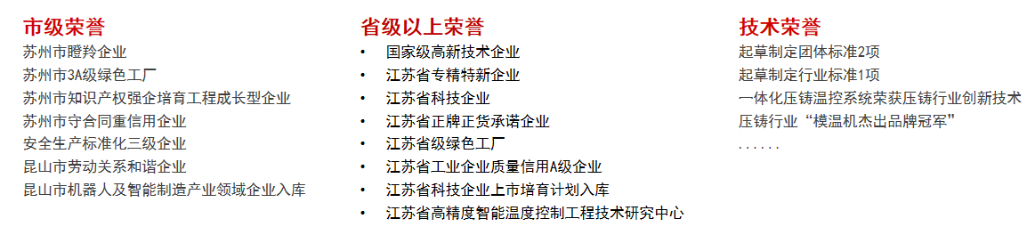 ● 行業口碑認可:連續兩年斬獲壓鑄行業 “模溫機杰出品牌冠軍”,2019 年成功通過知識產權貫標認證,獲評蘇州市瞪羚企業,并入選昆山市機器人及智能制造產業領域企業庫。一系列榮譽不僅是對公司實力的肯定,更奠定了其在工業溫控領域的領先品牌地位。
