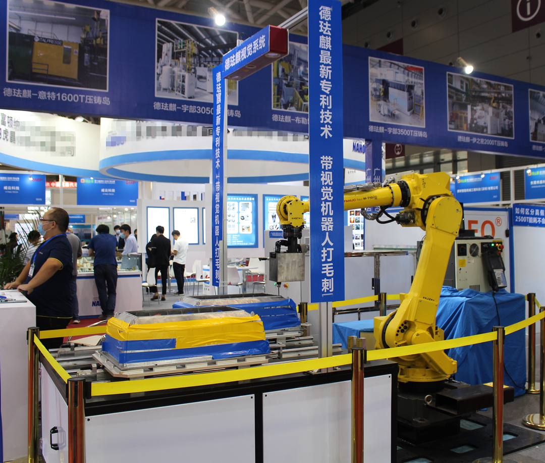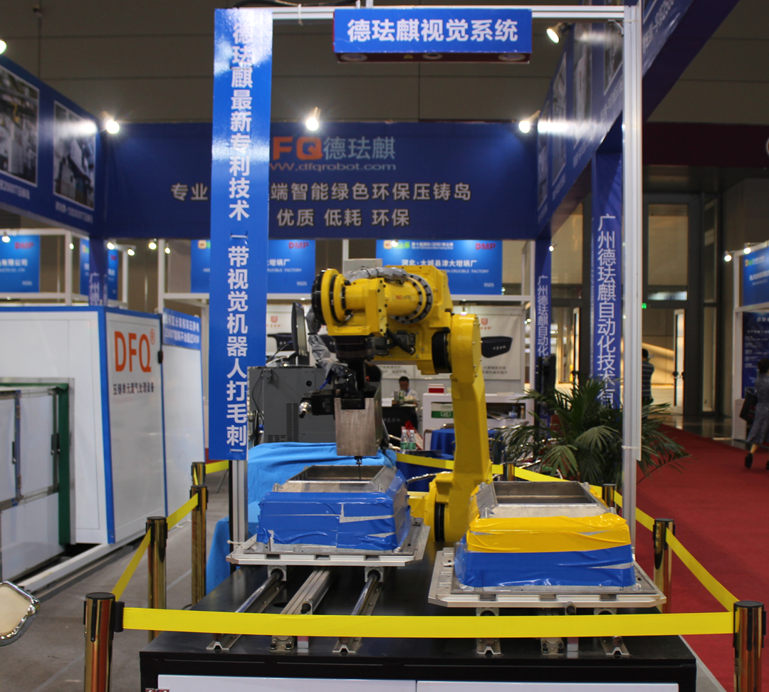設備外觀結構設計,科學合理,參考國內外企業的優點,維護簡單方便,罩殼采用一塊一塊鋁板拼湊,可獨立分拆,這樣的好處就是有一塊板壞了,只換故障的這塊,不用整體更換,節省了成本。同時,因內部結構沒有死角,在廢氣及少量廢液進入吸入煙塵罩里面,不會有清理困難,而且外部沒有拉管,也減少了安全隱患。整機設計更加科學合理。 據公司技術部負責人表示:“相對于國外品牌,德琺麒壓鑄單元廢氣處理設備使用簡單,廢氣處理效果好,維護成本低,性價比高,廣受用戶的認可。這也是國內許多壓鑄企業選擇德法麒設備的原因。目前,廣東鴻圖、武漢鴻圖、銘利達、榮嘉等知名壓鑄企業都使用了我們的設備,使用效果良好。” 機器人去毛刺激光視覺系統 據介紹,德琺麒機器人去毛刺激光視覺系統由公司自主研發,為首次在展會上展示。該系統是由一臺機器人、激光視覺定位系統、浮動雙刀頭組成。通過視覺定位,引導機器人自動矯正,可自動完成壓鑄件的識別及去毛刺的過程,節省了人工成本。該系統主要應用于汽車零部件制造行業。