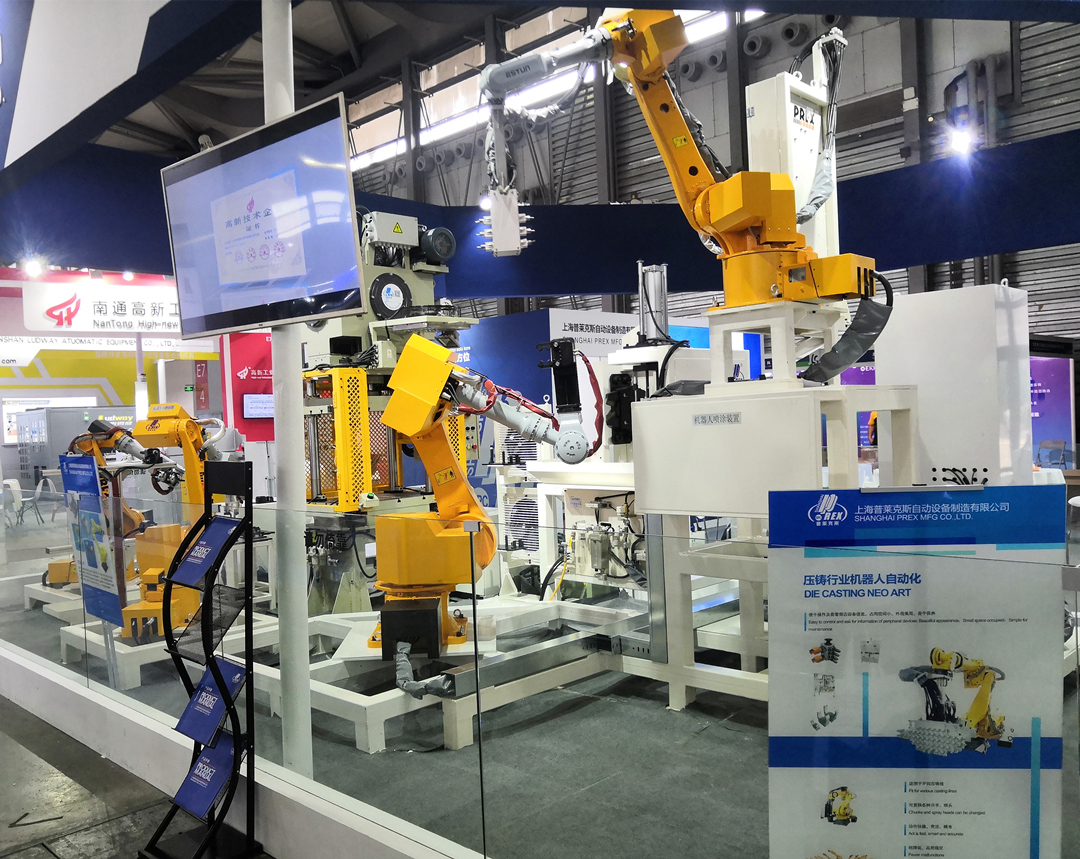 據了解,本屆展會,上海普萊克斯展示了一套涵括取件、噴涂、風冷、切邊、打磨拋光、機加工、碼垛等工序的全自動化壓鑄島解決方案。壓鑄自動化及周邊設備包括:機器人取件、機器人噴涂、風冷機、油壓機、打磨拋光設備、機器人上下料、機器人搬運等。