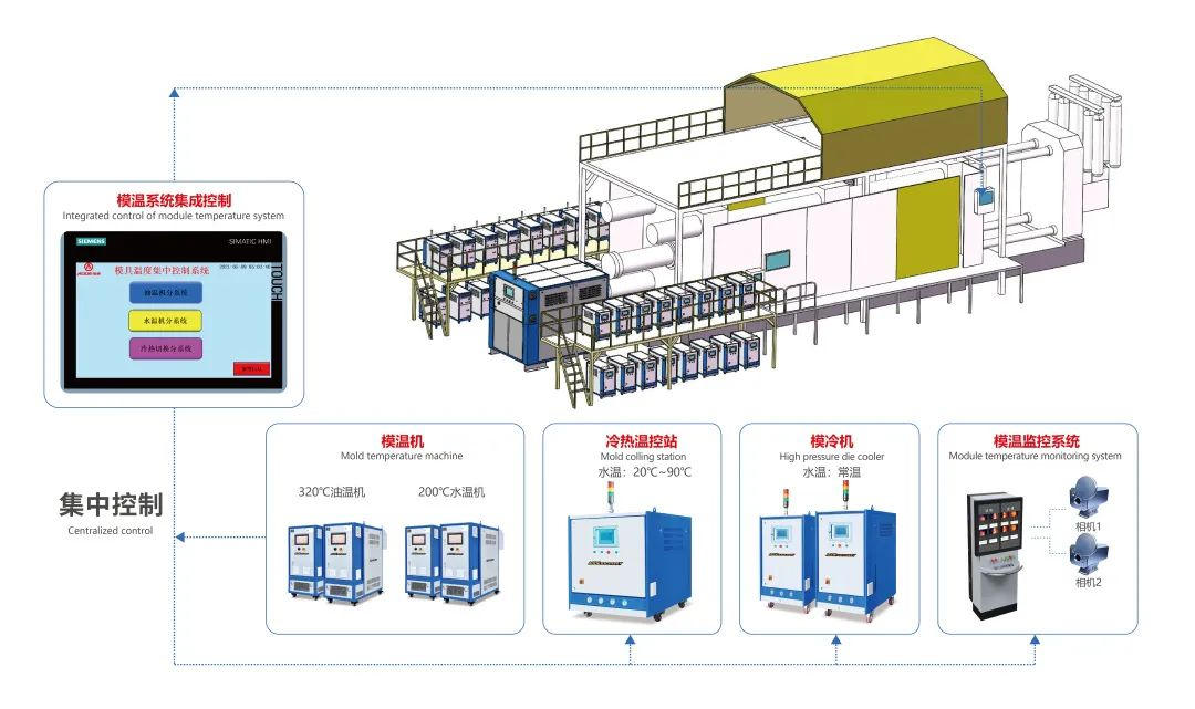現今,基于大型汽車一體化成型及技術的難點,對模具溫度平衡提出更高的要求,模具溫度控制成為剛性需求,奧德基于近二十年與汽車/航空/軍工/通訊、壓鑄市場的密切聯系,根據大型汽車壓鑄結構件一體化成型的溫控需求,研發設計出系統性的解決方案,并推出用于匹配“大型汽車壓鑄結構件一體化壓鑄”的一系列高溫、中溫、低溫溫控產品(200℃水溫機、320℃油溫機、冷熱溫控站、多通道模冷機,多通道點冷機、集成控制系統)。 超大型汽車壓鑄結構件流程長且薄壁,所以要求模具溫度具備在長流程過程中,根據不同的流態精準控制不同模區的溫度,因此對模溫控制的幅寬有著已知和未知的需求,因此,奧德在此基礎上,汲取以往設計應用經驗,設計20℃~320℃的大寬度溫區,給模具溫度平衡提供穩定且可控的溫源輸出,同時大幅度的溫度輸出不僅僅可以對模具進行溫度平衡控制,還可以延伸至對壓室、沖頭、分流錐、澆口套等進行溫度控制,因此留給了現場壓鑄產品工藝師足夠的操作余地。