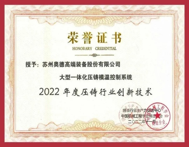 回首2022年,奧德在壓鑄模具溫度控制產(chǎn)品的種類上進(jìn)?了細(xì)化和優(yōu)化升級(jí),推出升級(jí)版的200℃/180℃?溫機(jī)、模具冷卻站、冷熱恒溫站、模溫集成控制系統(tǒng)等相關(guān)產(chǎn)品,覆蓋了?體化壓鑄模溫控制所需的所有設(shè)備,實(shí)現(xiàn)了20℃~320℃的大寬幅可調(diào)溫區(qū),給模具溫度平衡提供穩(wěn)定且可控的溫度源輸出。同時(shí),奧德的“大型一體化壓鑄溫控系統(tǒng)”獲得了由中國(guó)機(jī)械工程學(xué)會(huì)鑄造分會(huì)、鑄造行業(yè)生產(chǎn)力促進(jìn)中心評(píng)選的 “2022年度全國(guó)壓鑄行業(yè)創(chuàng)新技術(shù)與產(chǎn)品”稱號(hào),蘇州奧德高端裝備股份有限公司獲得了江蘇省“專精特新”企業(yè)。