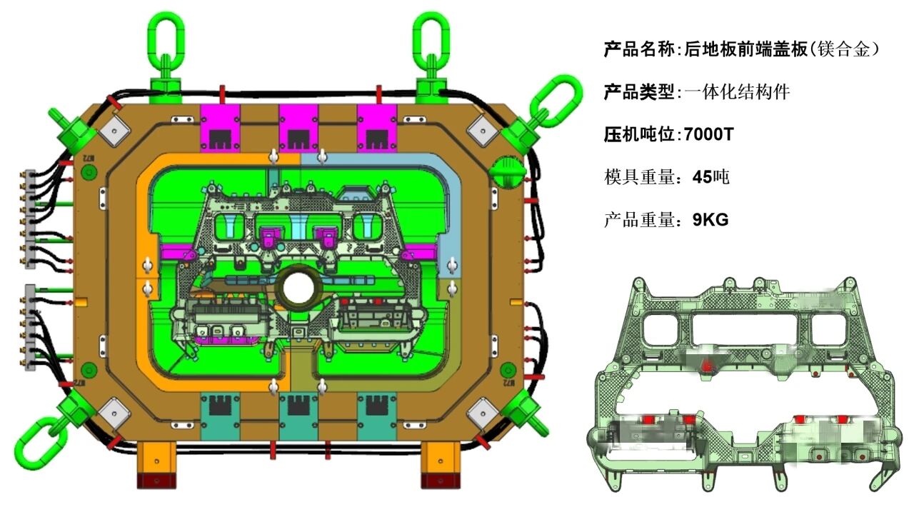 7000噸大型鎂合金壓鑄模具 2024年,搏潤(rùn)模具與重慶大學(xué)、寶武金屬、海天智勝金屬合作,成功開發(fā)全球首款鎂合金半固態(tài)注射成型車輪模具,開創(chuàng)行業(yè)先例。此后,公司又陸續(xù)開發(fā)了CCB支架半固態(tài)注射成型壓鑄模具、新能源減速器殼體高壓壓鑄模具;目前正在開發(fā)的7000噸雙壓射半固態(tài)成型后尾內(nèi)門板模具,更是行業(yè)首次使用鎂合金半固態(tài)注射成型工藝制造的超大型鑄件。隨著高壓壓鑄和半固態(tài)注射成型工藝的成熟,鎂合金的應(yīng)用將得到快速推廣。