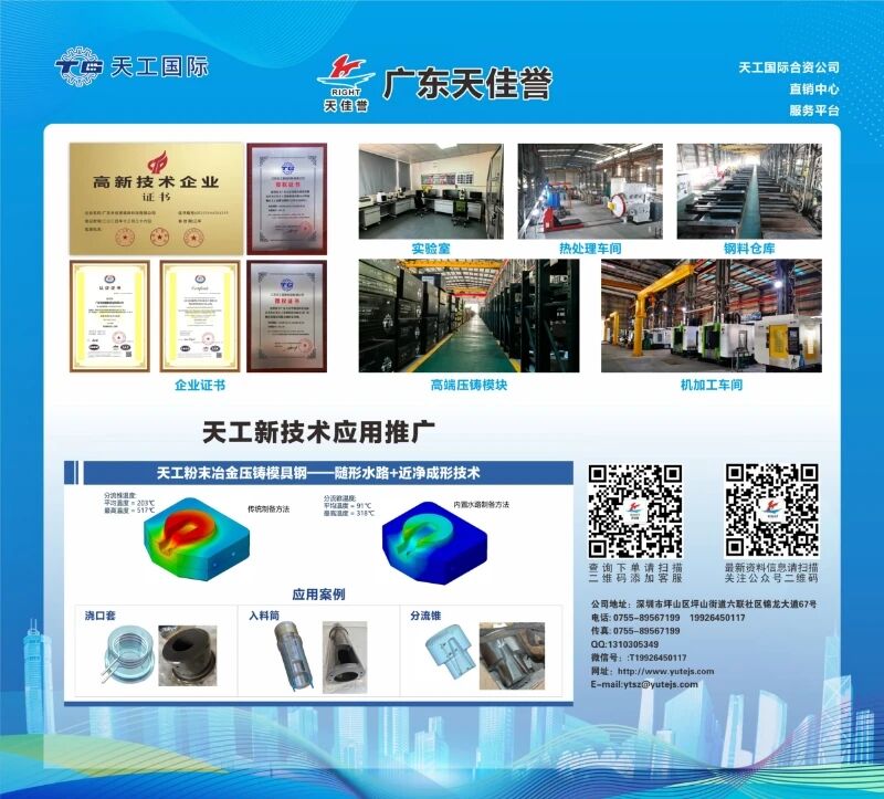 2025年由天工國際牽頭,聯(lián)合清華大學、寧德時代等八家單位共同參與國家重點研發(fā)項目-“新型壓鑄模具用鋼粉末冶金與增材制造關鍵技術研發(fā)與應用”,其中“天工粉末冶金壓鑄模具鋼-近凈成型+隨形冷卻技術”是該項目的重點內容之一。天佳譽作為天工國際的市場前沿肩負起了該技術在廣東地區(qū)的推廣應用。 在壓鑄生產中,料筒負責儲存、加熱并輸送金屬熔液;澆口套、分流錐作為料筒與模具的連接接口,引導熔液高效進入模具;分流錐實現(xiàn)熔液的均勻分流,避免渦流產生;沖頭則推動熔液完成注射填充;模具實現(xiàn)金屬液成型,通過模具的密封和導向,讓高溫金屬液在壓力下充滿型腔并冷卻凝固。這些部件及模具系壓鑄機澆注系統(tǒng)的關鍵組成部分,其質量直接關系到金屬熔液的輸送穩(wěn)定性、填充均勻性與成型效率,進而影響壓鑄件的尺寸精度、內部致密度與表面質量。 廣東天佳譽模具科技有限公司(簡稱“廣東天佳譽”)總經(jīng)理鄧志斌表示:“作為壓鑄機的主要損耗品,這些部件長期接觸高溫高壓的金屬熔液,會受到腐蝕、沖刷和熱疲勞作用等因素影響,進而影響生產效率和使用壽命。不過,通過“天工粉末冶金壓鑄模具鋼-近凈成型+隨形冷卻技術”的運用,不僅能提高產品性能,還能大幅提高水路冷卻效果,實現(xiàn)高效生產,降低能耗,提升生產價值。” 近日,“2025國際(深圳)鑄業(yè)展”在深圳國際會展中心成功舉辦。廣東天佳譽憑借其創(chuàng)新新技術產品“天工粉末冶金壓鑄模具鋼-近凈成形+隨形冷卻技術”成為展會焦點之一。該技術突破了傳統(tǒng)工藝局限,為壓鑄機及模具配件耗材提供了全新制造解決方案。