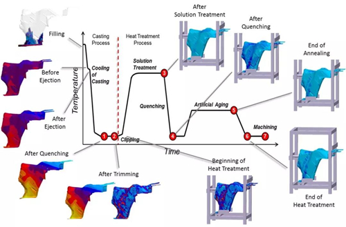 ![]() 圖20:結構件整個工藝的虛擬考慮,包括熱處理 對整個工藝的評估 除鑄件的模具和工藝布局的方法設計之外,結構部件的安全和穩健質量預測需要考慮到整個工藝。為了可靠地預測結構部件的屬性和變形,這尤其適用于鑄件從模具中脫出后的工藝步驟。 從圖20中可以看出,從鑄造工藝到鋁減震器熱處理的連續的性能和變形預測。MAGMASOFT®允許計算和評估鑄件的殘余應力(這些殘余應力是生產過程的結果)以及過程中任何時候的相應變形。設計階段框架內潛在風險的早期識別可使所有可用的自由度實施預防措施。此類措施可能包括鑄件設計變更、對模具的預防性幾何模型優化或熱處理工藝的調整布局。 對于復雜的大型結構部件,在熱處理過程中實現所需公差范圍內的穩定變形是一個特殊的挑戰。通常,一旦生產的第一批鑄件到達熱處理處,就會開始熱處理機架的設計;這通常通過反復試驗來優化。但是,虛擬熱處理試驗允許在規劃階段早期對機架進行優化設計。 變形的預測需要計算鑄造工藝中任何時候的局部殘余應力以及有效塑性應變。在該背景下,考慮了所有相關的工藝步驟:鑄件的凝固和脫出、移除鑄造系統、加熱、固溶處理、熱處理期間的淬火和回火,直到考慮最終的機加工步驟。 由固溶處理、淬火和回火組成的傳統T6熱處理后的結構部件變形(圖21)。MAGMASOFT®對熱處理過程的模擬利用了溫度和應變率相關蠕變模型,該模型考慮了重力對鑄件的載荷(特別是在固溶處理過程中)以及由此產生的變形。