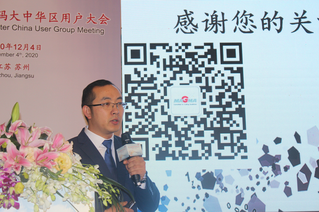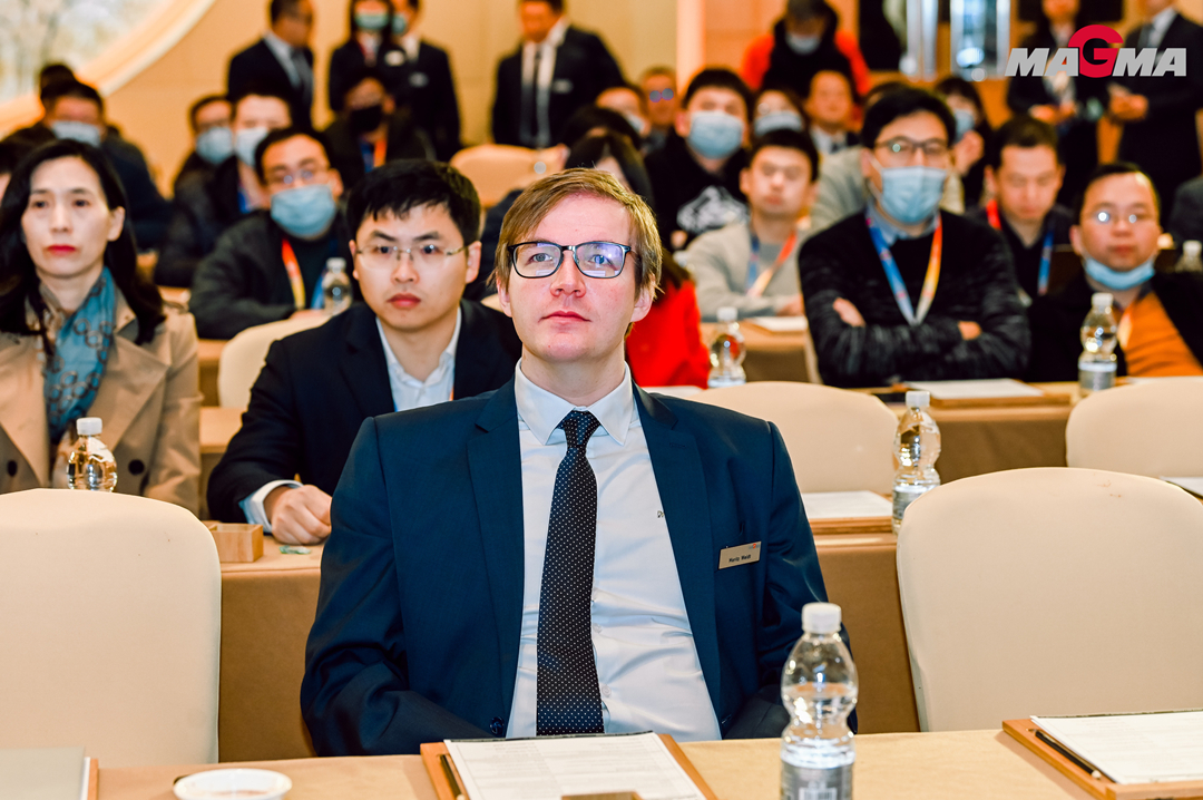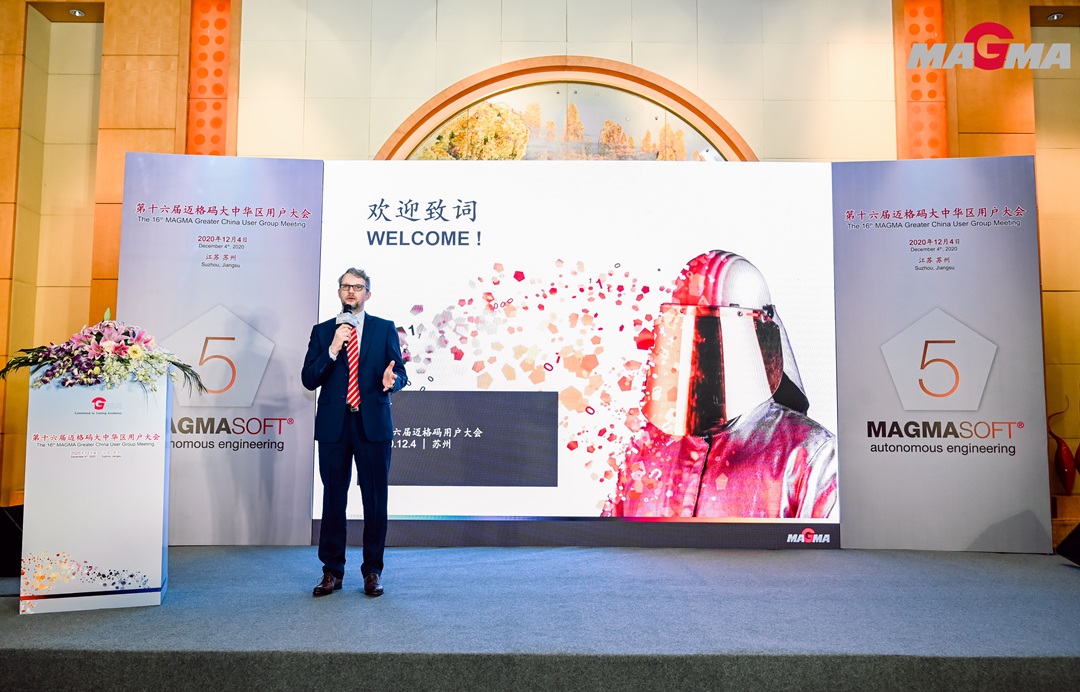 MAGMA中國總經理Mathieu Weber先生致辭 MAGMA中國CEO馬修先生致辭時,感謝各位嘉賓蒞臨大會,他介紹了MAMGA公司的全球布局以及MAGMA兩大產品MAGMASOFT®、SIGMASOFT®,回顧了過去一年MAGMA中國公司開展的各項工作,以及協助用戶解決的各種問題。