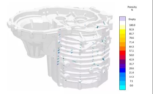圖1 該鑄件結(jié)構(gòu)復(fù)雜,帶水冷通道和集成結(jié)構(gòu),擬以金屬型鑄造方案生產(chǎn)。在經(jīng)過經(jīng)驗化鑄造工藝方案開發(fā)后,由MAGMASOFT模擬了充型和凝固過程,縮孔結(jié)果如下(圖2):