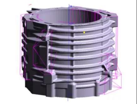 圖2 該結(jié)果似乎比較理想,因為MAGMASOFT顯示的縮孔缺陷偏小。然而該產(chǎn)品的質(zhì)量要求高,需要更加可靠的方案來確保更完美的鑄件以得到縮孔極致小、生產(chǎn)穩(wěn)定可控的鑄造工藝方案。但結(jié)構(gòu)如此復(fù)雜的大型鋁鑄件,試模費用相當(dāng)高。如果沒有可信的實施方案,勢必費時費力費成本。于是,開發(fā)團(tuán)隊首先基于鑄件質(zhì)量要求對該鑄件做了局部化識別,見下圖3。