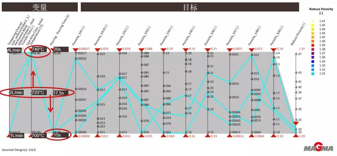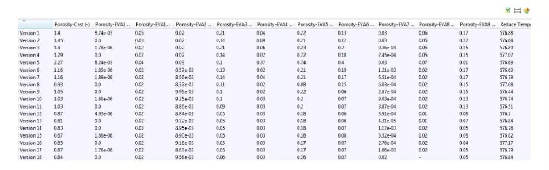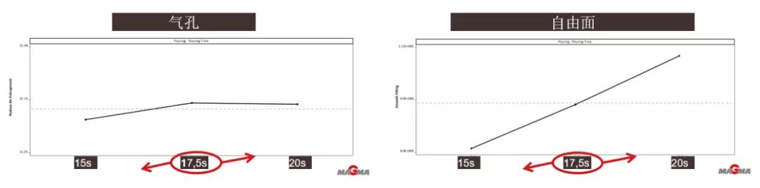 表1 基于此前的局域區(qū)域,設(shè)定了最小化縮孔、氣孔和充型自由面3個判據(jù)。經(jīng)過MAGMASOFT的DoE分析,得出如下結(jié)論: