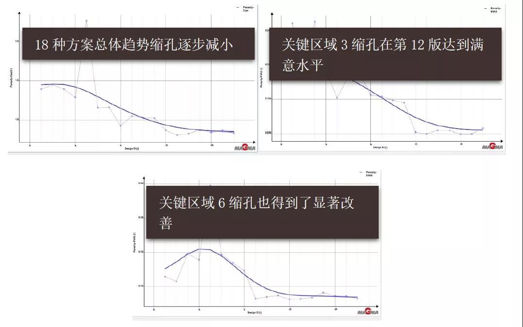 圖5 經(jīng)過軟件提供的統(tǒng)計圖表如圖6分析,開發(fā)團(tuán)隊發(fā)現(xiàn):總體上隨著方案的推進(jìn),鑄件縮孔逐步減小,見圖6: