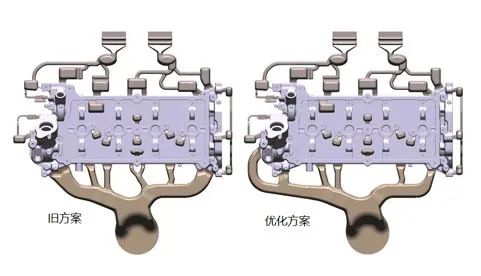 圖2 產品缺陷圖片及模擬熱節點 2、方案自動優化模擬分析 針對以上的分析,準備從2個方面進行改進。首先在保證零件成型的前提下,對澆注方案進行優化。由于縮孔的形成原因是產品壁厚較厚,增加后難以補縮,所以在澆注系統優化上先縮小熱節處的澆口面積,減少流經熱節點處的鋁料,降低模具升溫的幅度。修改后的方案對比圖見圖3所示。其次,澆注系統更改后,與之相匹配的工藝參數也要隨之變化。在本案例中,以高速速度為變量,以較小的熱節值為目標,結合軟件的優化功能讓軟件自動運算,輸出判定結果。圖4為設計高速速度為變量的設定圖示。