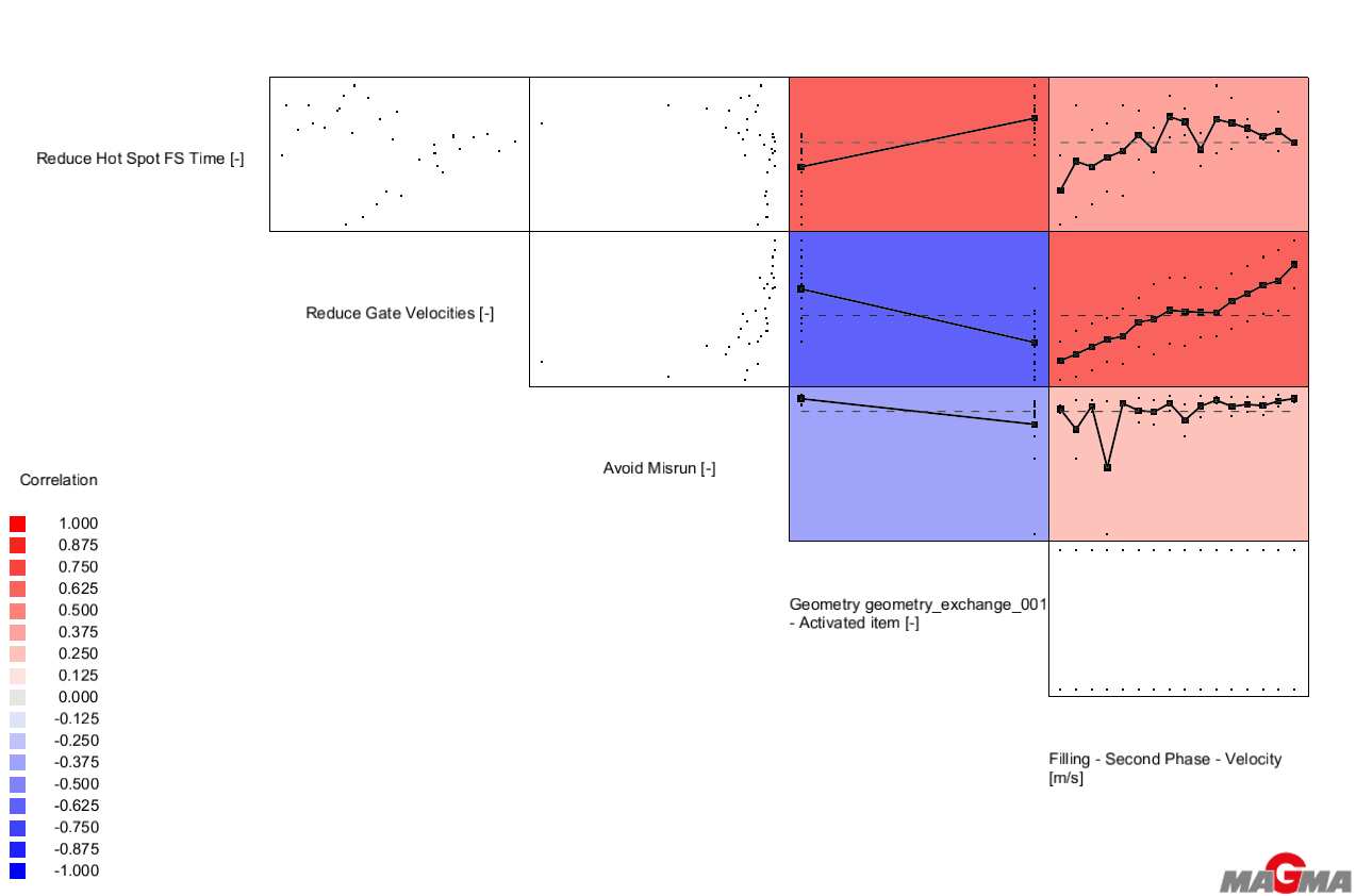 圖4 壓鑄工藝參數優化設計圖 圖5為自主優化的模擬結果。圖5a中每一條彩色線段為一組工藝參數方案,共5個豎軸,從左至右分為高速變化區間,壓射方案變化區間,成型溫度結果范圍,內澆口速度范圍和熱節時間范圍。通過拖動每個豎軸上下兩端的箭頭來獲得最佳的工藝方案,例如想要最低熱節時間,往下拖動豎軸上端箭頭,最后得到最小的熱節時間為方案1,同時方案1的成型溫度也較高,內澆口速度相對較低。圖5b左豎軸為熱節時間范圍,右豎軸為成型溫度結果范圍,下橫軸為全部工藝方案,通過觀察溫度和熱節時間的變化曲線,可以發現方案1的成型溫度相對較高,熱節時間最短。圖5c最上一排為熱節時間根據不同方案和高速速度的變化規律,第二排為內澆口速度根據不同方案和高速速度的變化規律,第三排為成型溫度根據不同方案和高速速度的變化規律,右一豎排為高速速度的變化范圍,右二豎排為幾何方案的變化范圍,以熱節時間結果為例,該結果時間變長隨著從方案一切換到方案二,同時其總體趨勢隨著高速速度的提升而變長,所以通過觀察其變化規律,從而抓出最準確的方案與工藝參數。綜合以上所述,在保證成型溫度的基礎上,采用相對較低的壓射速度并配合壓射方案一,可以獲得最小的熱節時間,通過減小熱節時間,從而降低實際生產中所出現的凝固收縮類缺陷。