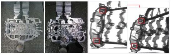 c.總變量與總目標變化趨勢圖片 圖5 模擬結果 3、實際驗證 根據優化后的澆注方案以及工藝參數進行實際生產,對壓鑄出產品做內部質量檢測,檢測結果顯示產品壁厚位置縮孔得到改善,如圖6所示。實踐結果表明通過采用改善后的壓射方案并配合最佳工藝參數,解決了實際中產品出現的缺陷。