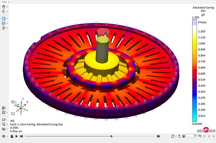 圖1:特別是在幾何體、網(wǎng)格和結(jié)果界面,新的工具欄按照功能精簡(jiǎn)并分組,支持用戶更高效的工作 幾何界面的新功能方便用戶進(jìn)行幾何體的編輯,新的三維坐標(biāo)系統(tǒng)使用戶能夠更加直觀的旋轉(zhuǎn)和定位幾何體。在MAGMASOFT®6.0中,用戶可以在幾何界面中保存顯示設(shè)置,并在幾何界面和其他界面使用保存的顯示設(shè)置。例如,在幾何界面中預(yù)先保存重要的視圖,并在以后使用它們對(duì)結(jié)果進(jìn)行(自動(dòng))評(píng)估。這有助于在項(xiàng)目開始時(shí)就能更快、更有效地進(jìn)行鑄造和工藝開發(fā)。 MAGMASOFT®6.0的項(xiàng)目加載時(shí)間縮短了80%,這有助于他們?cè)趩蝹€(gè)項(xiàng)目或項(xiàng)目版本之間更快速地切換。 新的結(jié)果色標(biāo)以及可視化——強(qiáng)大的結(jié)果評(píng)估 MAGMASOFT®6.0新增連續(xù)色標(biāo)和升級(jí)版的X射線顯示,使模擬結(jié)果的評(píng)估更加真實(shí)和精確(圖2和圖3)。此外,色標(biāo)的刻度值可以直接調(diào)整或用鼠標(biāo)滾輪調(diào)整。