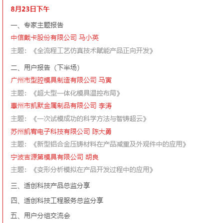 同期活動:適創(chuàng)用戶大會 作為大賽的主辦單位,也作為大賽指定模流分析軟件供應商,適創(chuàng)科技是自主仿真軟件的代表,也始終致力于為中國壓鑄和模具行業(yè)的發(fā)展貢獻力量,就在8月23日同一地點,適創(chuàng)科技將舉辦2024第二屆用戶大會,共同見證“適創(chuàng)杯”冠軍的誕生,同時我們將匯集行業(yè)的頂尖專家、企業(yè)代表和適創(chuàng)模流軟件的深度用戶,進行一次前瞻的、深刻的、創(chuàng)新的研討和交流,為推動壓鑄行業(yè)的高質(zhì)量發(fā)展注入強大動力,共同見證行業(yè)的創(chuàng)新發(fā)展和變革圖景!