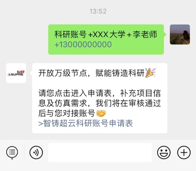 STEP 02 發(fā)送關(guān)鍵詞【科研賬號(hào)+機(jī)構(gòu)全稱+申請(qǐng)人姓名+手機(jī)號(hào)】,填寫專屬申請(qǐng)表,提交研究項(xiàng)目及仿真需求
